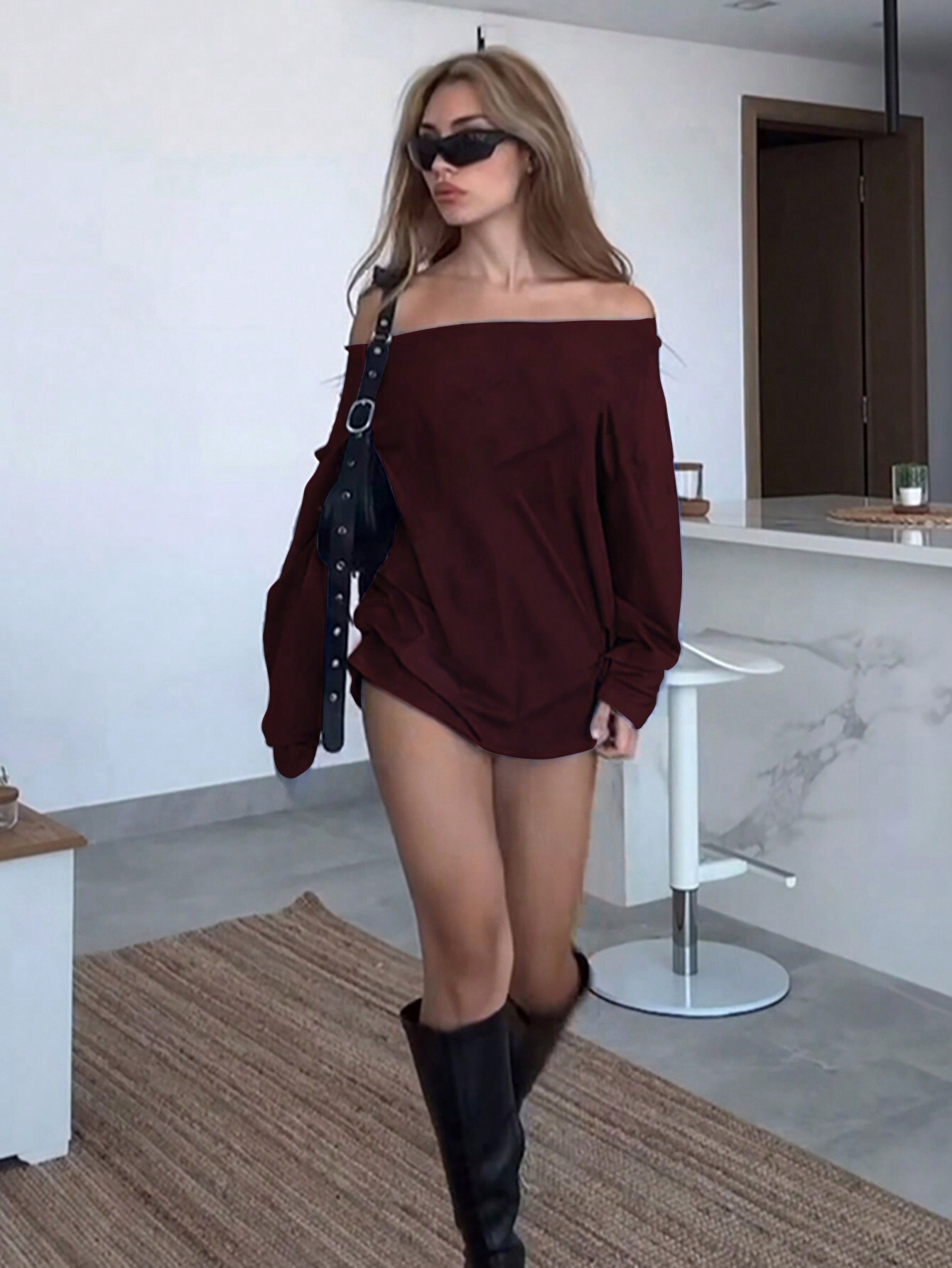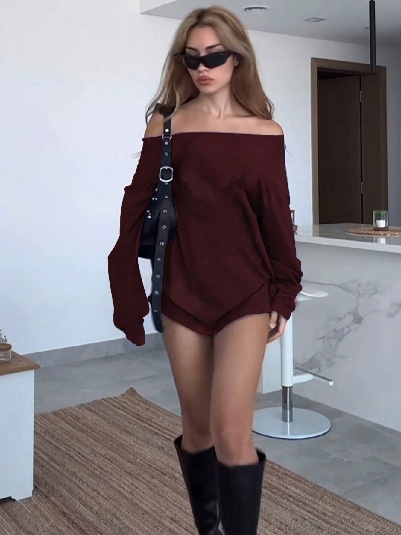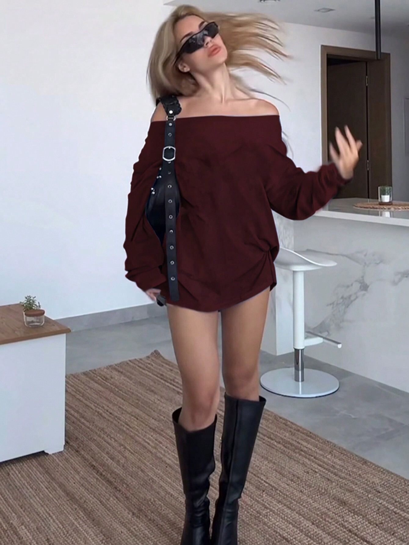 Sweet And Spicy Style Burgundy Dress Off-shoulder Loose Short Dress For Autumn And Winter